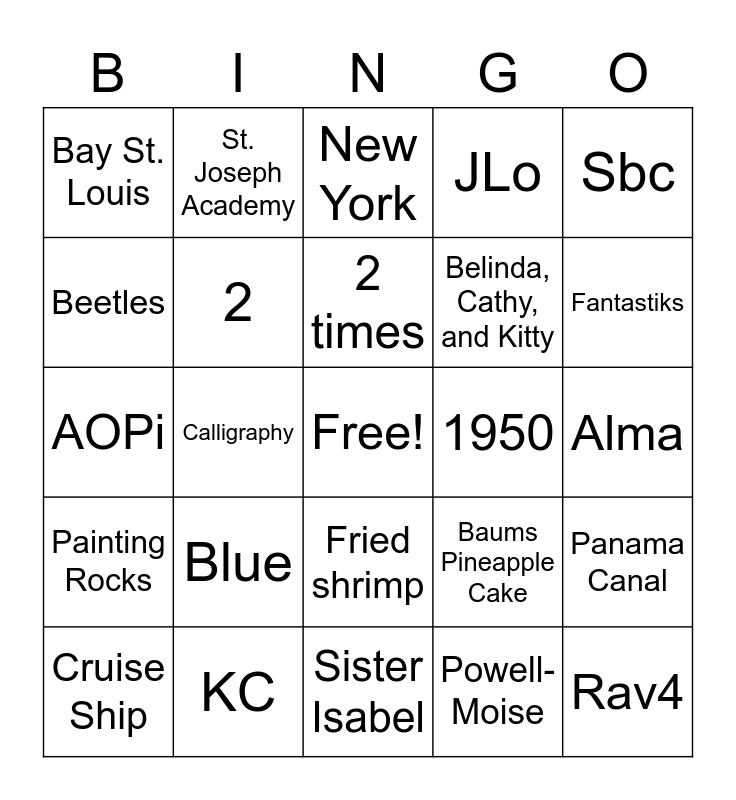 This bingo card has a free space and 24 words: Blue, KC, 2 times, Cruise Ship, Sbc, Bay St. Louis, Beetles, St. Joseph Academy, 1950, Fried shrimp, Belinda, Cathy, and Kitty, AOPi, Baums Pineapple Cake, Panama Canal, 2, Powell-Moise, Alma, New York, Fantastiks, Calligraphy, Rav4, Painting Rocks, JLo and Sister Isabel.