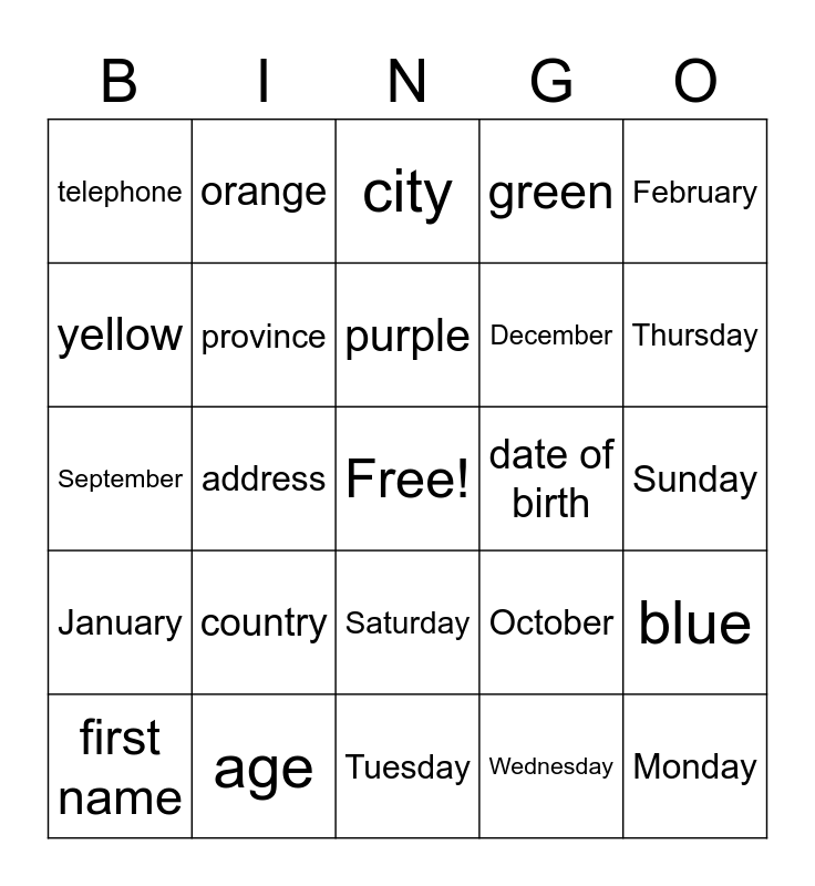 This bingo card has a free space and 29 words: first name, last name, address, postal code, telephone, city, province, country, date of birth, age, Sunday, Monday, Tuesday, Wednesday, Thursday, Friday, Saturday, January, February, September, October, November, December, yellow, green, orange, blue, purple and red.
