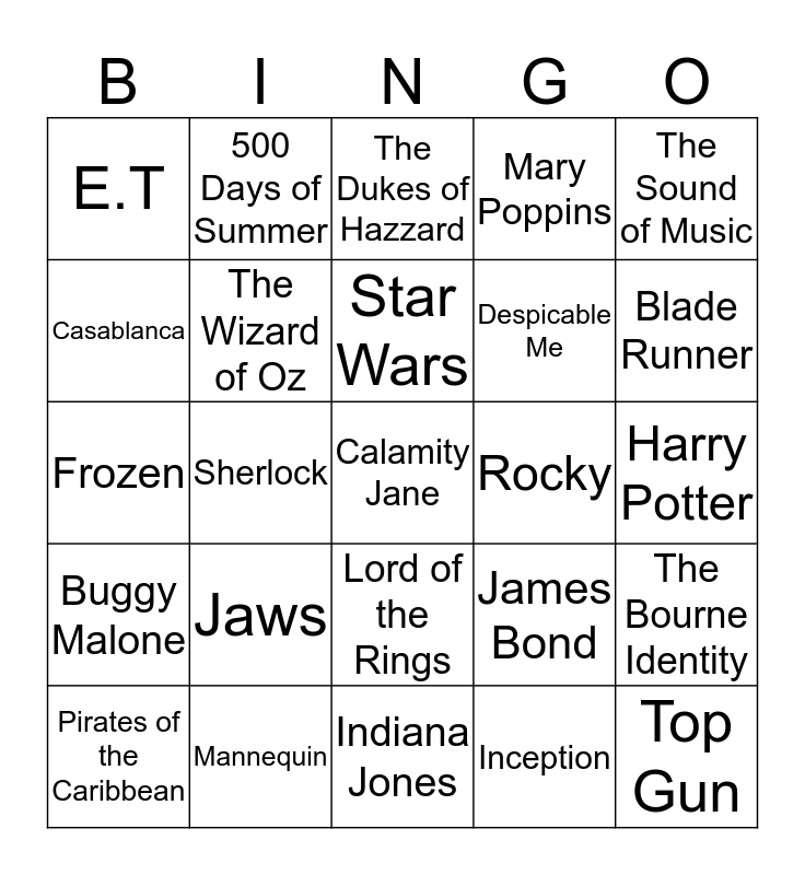This bingo card has 25 words: Jaws, Indiana Jones, Star Wars, Pirates of the Caribbean, The Sound of Music, E.T, Casablanca, 500 Days of Summer, Rocky, Lord of the Rings, Despicable Me, Frozen, James Bond, The Bourne Identity, The Wizard of Oz, Top Gun, Harry Potter, The Dukes of Hazzard, Blade Runner, Sherlock, Calamity Jane, Mannequin, Buggy Malone, Mary Poppins and Inception.