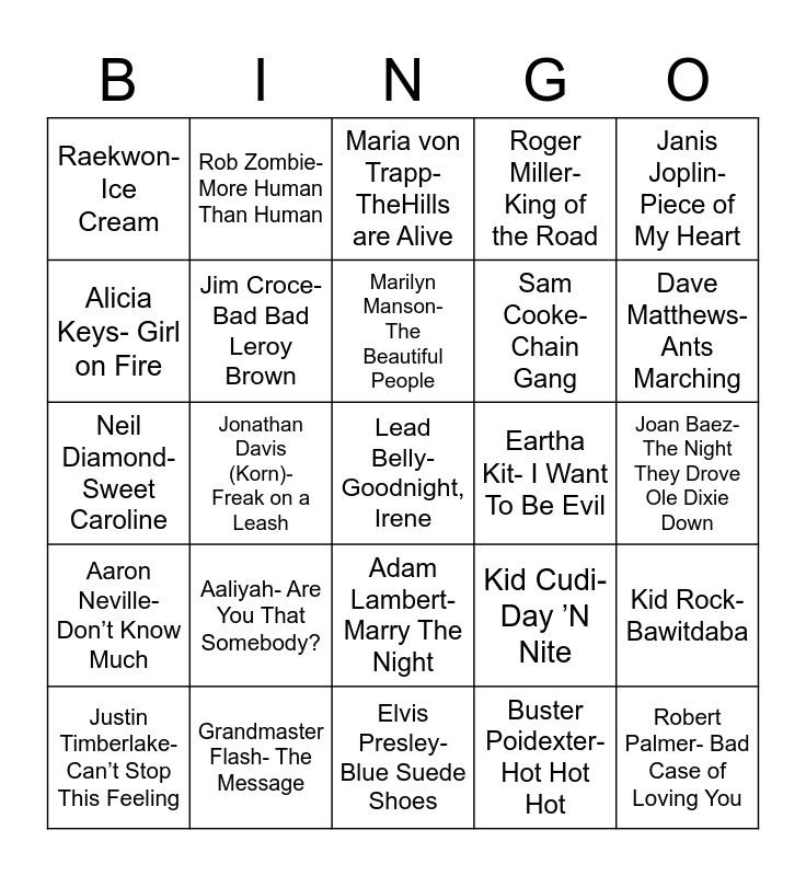This bingo card has 25 words: Aaliyah- Are You That Somebody?, Elvis Presley- Blue Suede Shoes, Marilyn Manson- The Beautiful People, Justin Timberlake- Can’t Stop This Feeling, Janis Joplin- Piece of My Heart, Raekwon- Ice Cream, Alicia Keys- Girl on Fire, Rob Zombie- More Human Than Human, Eartha Kit- I Want To Be Evil, Adam Lambert- Marry The Night, Sam Cooke- Chain Gang, Neil Diamond- Sweet Caroline, Kid Cudi- Day ’N Nite, Kid Rock- Bawitdaba, Jim Croce- Bad Bad Leroy Brown, Robert Palmer- Bad Case of Loving You, Joan Baez- The Night They Drove Ole Dixie Down, Maria von Trapp- TheHills are Alive, Dave Matthews- Ants Marching, Jonathan Davis (Korn)- Freak on a Leash, Lead Belly- Goodnight, Irene, Grandmaster Flash- The Message, Aaron Neville- Don’t Know Much, Roger Miller- King of the Road and Buster Poidexter- Hot Hot Hot.