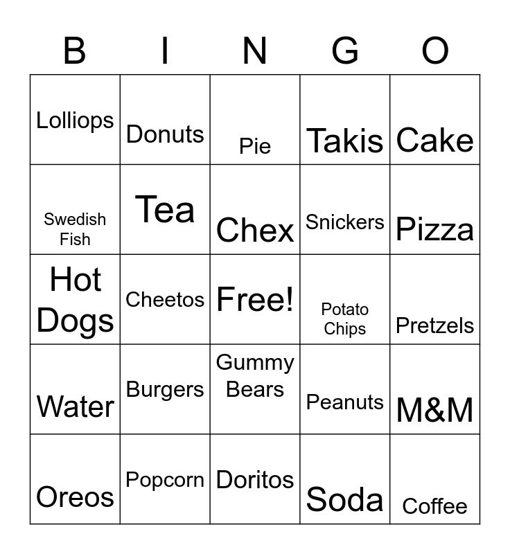This bingo card has a free space and 24 words: Burgers, Popcorn, Chex, Oreos, Cake, Lolliops, Swedish Fish, Donuts, Potato Chips, Gummy Bears, Snickers, Hot Dogs, Peanuts, M&M, Tea, Soda, Pretzels, Pie, Pizza, Cheetos, Coffee, Water, Takis and Doritos.