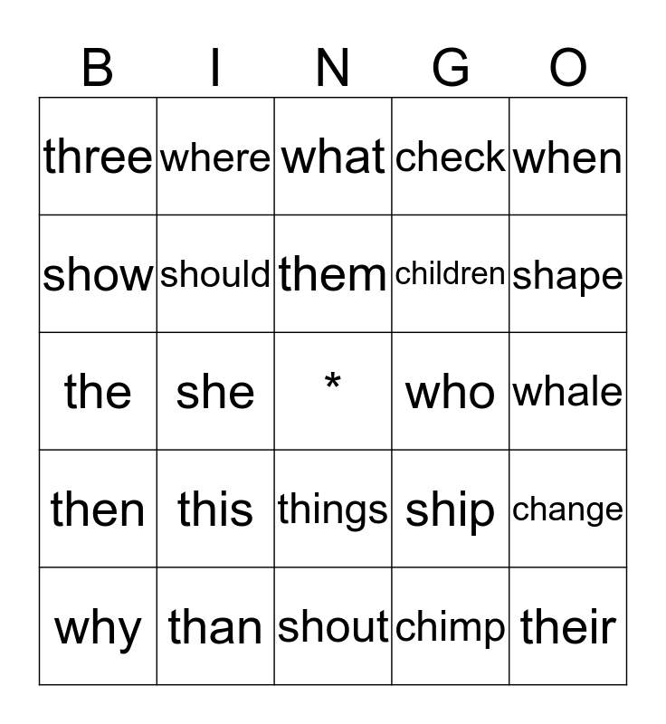 This bingo card has a free space and 24 words: this, than, them, why, when, three, show, where, who, things, children, the, ship, change, should, chimp, whale, what, shape, she, their, then, check and shout.
