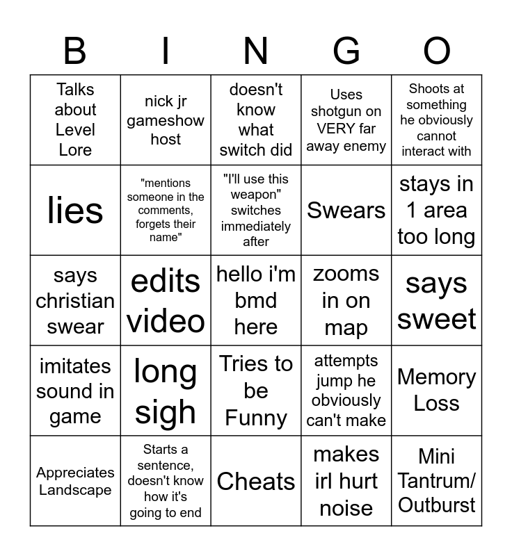This bingo card has a free space and 58 words: Apologizes for Gameplay, Starts a sentence, doesn't know how it's going to end, uncomfortable sexual innuendo, imitates sound in game, makes irl hurt noise, "ur dead", "mentions someone in the comments, forgets their name", uses fists, Swears, Misses Obvious Route, Uses shotgun on VERY far away enemy, Roleplaying as Player character, Says "yaaaaay" like a 5 yo, Falls to death missing easy platform jump, Forced Laughter, Talks about Level Lore, Mini Tantrum/ Outburst, Shoots at something he obviously cannot interact with, Asks the Viewer a Question, "I'll use this weapon" switches immediately after, zooms in on map, doesn't know what switch did, Appreciates Landscape, Memory Loss, mentions pop culture reference, says sweet, talks in third person, talks about revenant missiles, stays in 1 area too long, runs away from enemy immediately after seeing it, fights enemies through from outside doorway, seduces cacodemon, mentions doomguy, self deprecation, does something smart, Big Cringe Davis, can't talk and progress at the same time, edits video, says christian swear, says woah, long sigh, Dies to enemy, attempts jump he obviously can't make, misses pop culture reference, Gets Confidence, Mentions Other Game, Does Something Dumb, Tries to be Funny, Cheats, real laughter, knows about the bingo card, hears us, wastes our time, blindness, nick jr gameshow host, "kill you", lies and says cool.
