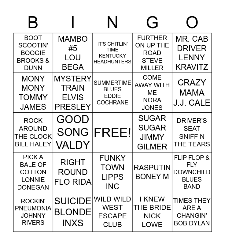 This bingo card has a free space and 24 words: RIGHT ROUND FLO RIDA, SUICIDE BLONDE INXS, SUMMERTIME BLUES EDDIE COCHRANE, ROCKIN' PNEUMONIA JOHNNY RIVERS, MR. CAB DRIVER LENNY KRAVITZ, BOOT SCOOTIN' BOOGIE BROOKS & DUNN, MONY MONY TOMMY JAMES, MAMBO #5 LOU BEGA, SUGAR SUGAR JIMMY GILMER, FUNKY TOWN LIPPS INC, COME AWAY WITH ME NORA JONES, ROCK AROUND THE CLOCK BILL HALEY, RASPUTIN BONEY M, FLIP FLOP & FLY DOWNCHILD BLUES BAND, MYSTERY TRAIN ELVIS PRESLEY, I KNEW THE BRIDE NICK LOWE, DRIVER'S SEAT SNIFF N THE TEARS, IT'S CHITLIN' TIME KENTUCKY HEADHUNTERS, CRAZY MAMA J.J. CALE, GOOD SONG VALDY, TIMES THEY ARE A CHANGIN' BOB DYLAN, PICK A BALE OF COTTON LONNIE DONEGAN, FURTHER ON UP THE ROAD STEVE MILLER and WILD WILD WEST ESCAPE CLUB.