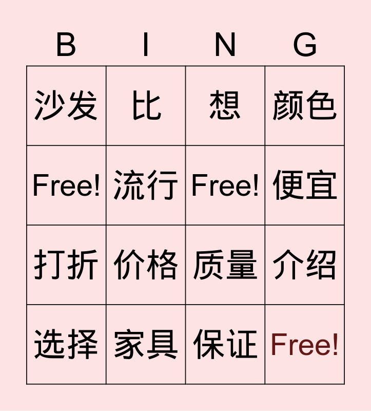 This bingo card has 16 words: 家具, 介绍, 想, 沙发, 打折, 比, 质量, 保证, Free!, 流行, 选择, 颜色, 价格, 便宜, Free! and Free!.