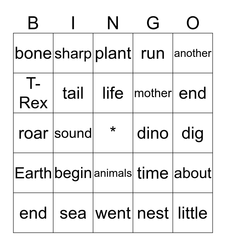 This bingo card has a free space and 24 words: begin, sea, life, end, another, bone, T-Rex, sharp, dino, animals, mother, roar, time, about, tail, nest, dig, plant, end, sound, little, Earth, run and went.