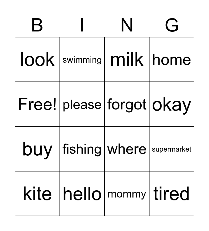 This bingo card has 16 words: hello, supermarket, milk, look, buy, swimming, where, mommy, Free!, please, kite, home, fishing, okay, forgot and tired.