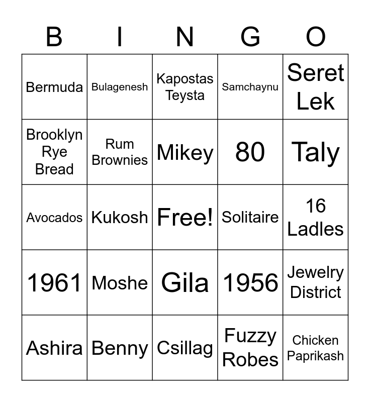This bingo card has a free space and 24 words: Moshe, Benny, Mikey, Ashira, Seret Lek, Bermuda, Brooklyn Rye Bread, Bulagenesh, Solitaire, Gila, 80, Avocados, 1956, Jewelry District, Rum Brownies, Fuzzy Robes, 16 Ladles, Kapostas Teysta, Taly, Kukosh, Chicken Paprikash, 1961, Samchaynu and Csillag.