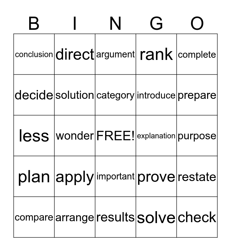 This bingo card has a free space and 24 words: apply, arrange, category, compare, complete, conclusion, decide, direct, explanation, important, introduce, less, prove, restate, solution, solve, purpose, argument, prepare, wonder, check, plan, rank and results.