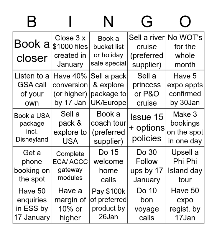 This bingo card has 25 words: Complete ECA/ ACCC gateway modules, Pay $100k of preferred product by 26Jan, Sell a pack & explore package to UK/Europe, Have 50 enquiries in ESS by 17 January, No WOT's for the whole month, Book a closer, Listen to a GSA call of your own, Close 3 x $1000 files created in January, Issue 15 + options policies, Do 15 welcome home calls, Sell a princess or P&O cruise, Book a USA package incl. Disneyland, Do 30 Follow ups by 17 January, Upsell a Phi Phi Island day tour, Have 40% conversion (or higher) by 17 Jan, Have 50 expo regist. by 17Jan, Make 3 bookings on the spot in one day, Book a bucket list or holiday sale special, Have 5 expo appts confirmed by 30Jan, Sell a pack & explore to USA, Book a coach tour (preferred supplier), Have a margin of 10% or higher, Get a phone booking on the spot, Sell a river cruise (preferred supplier) and Do 10 bon voyage calls.