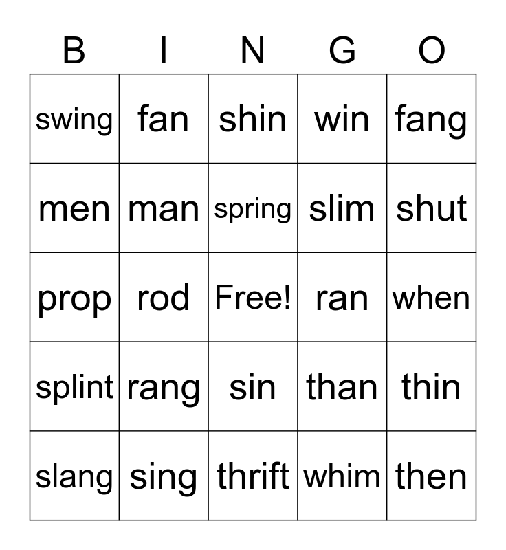 This bingo card has a free space and 24 words: rang, sing, spring, slang, fang, swing, men, fan, ran, sin, slim, prop, than, thin, man, whim, when, shin, shut, rod, then, splint, win and thrift.
