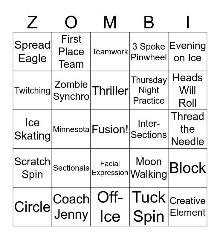 This bingo card has a free space and 24 words: Sectionals, Coach Jenny, Thriller, Circle, Evening on Ice, Spread Eagle, Twitching, First Place Team, Inter-Sections, Facial Expression, Thursday Night Practice, Ice Skating, Moon Walking, Block, Zombie Synchro, Tuck Spin, Thread the Needle, Teamwork, Heads Will Roll, Minnesota, Creative Element, Scratch Spin, 3 Spoke Pinwheel and Off-Ice.