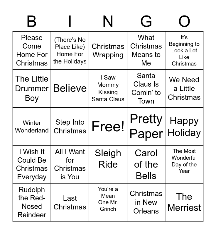 This bingo card has a free space and 24 words: All I Want for Christmas is You, Last Christmas, I Saw Mommy Kissing Santa Claus, Rudolph the Red-Nosed Reindeer, It’s Beginning to Look a Lot Like Christmas, Please Come Home For Christmas, The Little Drummer Boy, (There’s No Place Like) Home For the Holidays, Pretty Paper, Sleigh Ride, Santa Claus Is Comin’ to Town, Winter Wonderland, Carol of the Bells, The Most Wonderful Day of the Year, Believe, Christmas in New Orleans, Happy Holiday, Christmas Wrapping, We Need a Little Christmas, Step Into Christmas, The Merriest, I Wish It Could Be Christmas Everyday, What Christmas Means to Me and You’re a Mean One Mr. Grinch.