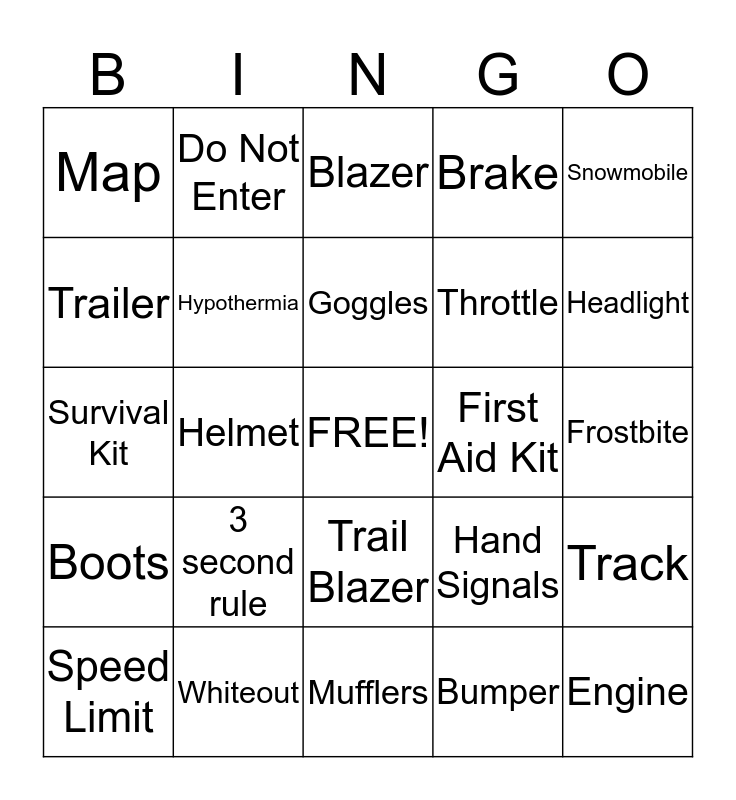 This bingo card has a free space and 33 words: Stop Sign, Trail Pass, Helmet, Gloves, Boots, Hypothermia, Snowmobile, Speed Limit, Do Not Enter, Yield, Goggles, Blazer, Chevron, Don't Drink and Drive, First Aid Kit, Headlight, Whiteout, Survival Kit, 3 second rule, Hand Signals, Trail Blazer, Snowmobile Laws, Map, Frostbite, Mufflers, Engine, Brake, Throttle, Trailer, Track, Snowmobile Routes, Bumper and Hand Signals.