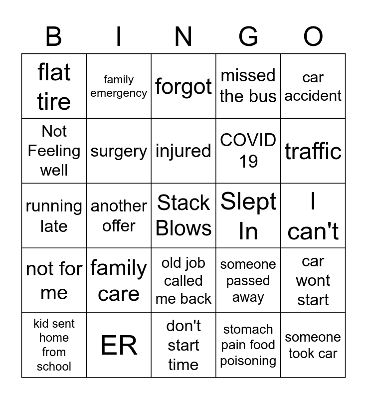 This bingo card has a free space and 24 words: family care, ER, injured, kid sent home from school, car accident, flat tire, Not Feeling well, family emergency, Slept In, old job called me back, COVID 19, running late, someone passed away, car wont start, surgery, stomach pain food poisoning, I can't, forgot, traffic, another offer, someone took car, not for me, missed the bus and don't start time.