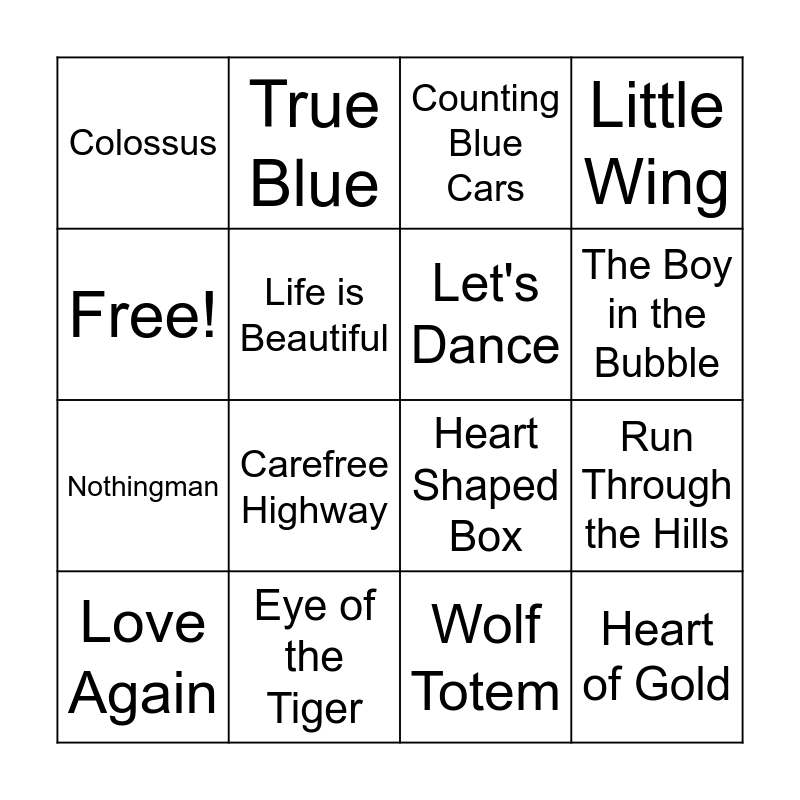 This bingo card has 16 words: Eye of the Tiger, Run Through the Hills, Counting Blue Cars, Colossus, Nothingman, True Blue, Heart Shaped Box, Wolf Totem, Free!, Life is Beautiful, Love Again, Little Wing, Carefree Highway, The Boy in the Bubble, Let's Dance and Heart of Gold.