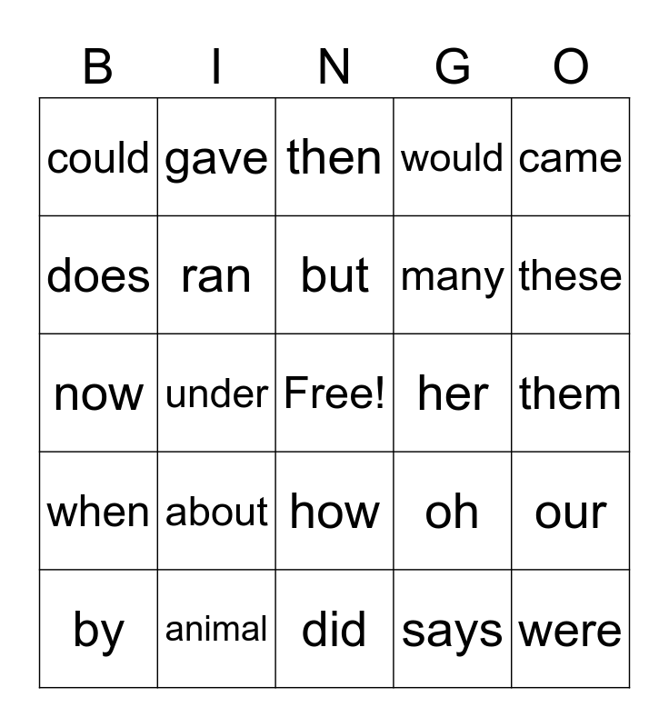This bingo card has a free space and 24 words: about, animal, but, by, came, could, does, gave, her, how, many, now, oh, our, ran, says, them, then, these, under, were, when, would and did.