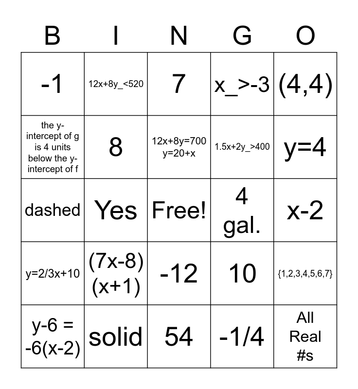This bingo card has a free space and 31 words: 54, No, Yes, 42, -1, 7, 8, 10, 4 gal., -1/4, x-2, All Real #s, All real #s less than or equal to 4, $4, y=4, (-1,1), {1,2,3,4,5,6,7}, (7x-8)(x+1), y=2/3x+10, -12, (4,4), 2 & 6, y-6 = -6(x-2), 12x+8y_<520, 1.5x+2y_>400, the y-intercept of g is 4 units below the y-intercept of f, x_>-3, dashed, solid, 12x+8y=700 y=20+x and Domain: AllReal #s Range: 13.