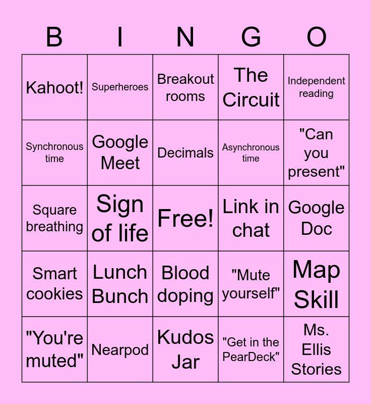 This bingo card has a free space and 29 words: "You're muted", "Background noise", Sign of life, Google Classroom, Kahoot!, Breakout rooms, Google Meet, Lunch Bunch, Link in chat, Nearpod, Google Doc, Ms. Ellis Stories, Kudos Jar, "Get in the PearDeck", "Can you present", Character traits, Blood doping, Smart cookies, Independent reading, Square breathing, "Mute yourself", "Can everyone see my screen?", Asynchronous time, Synchronous time, The Circuit, Superheroes, Map Skill, Decimals and Number lines.