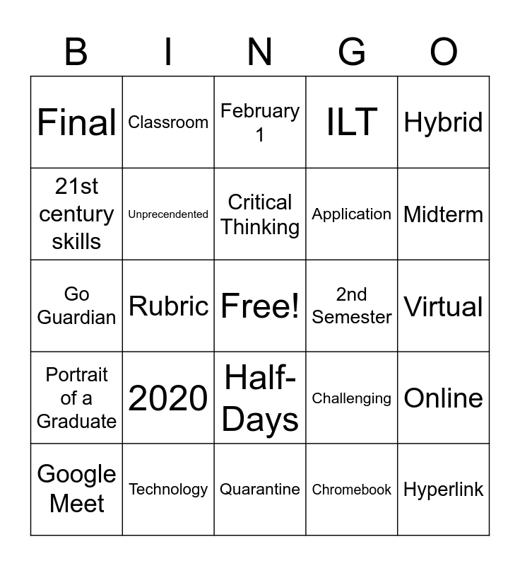 This bingo card has a free space and 36 words: Authentic Assessment, COVID, Pandemic, Unprecendented, Challenging, Portrait of a Graduate, Critical Thinking, Rigor(ous), Hybrid, Remote, Rubric, ILT, Professional Development, 2nd Semester, Midterm, Final, Strange, 2020, Hyperlink, February 1, Virtual, Online, Technology, Google Meet, Quarantine, Classroom, Go Guardian, Standards, Application, 21st century skills, Digital, Resources, Chromebook, Half-Days, Reflection and Self-Assessment.