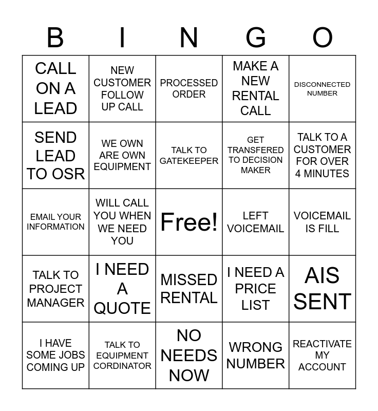 This bingo card has a free space and 24 words: I NEED A QUOTE, TALK TO EQUIPMENT CORDINATOR, TALK TO GATEKEEPER, I HAVE SOME JOBS COMING UP, DISCONNECTED NUMBER, CALL ON A LEAD, SEND LEAD TO OSR, NEW CUSTOMER FOLLOW UP CALL, LEFT VOICEMAIL, MISSED RENTAL, GET TRANSFERED TO DECISION MAKER, EMAIL YOUR INFORMATION, I NEED A PRICE LIST, AIS SENT, WE OWN ARE OWN EQUIPMENT, WRONG NUMBER, VOICEMAIL IS FILL, PROCESSED ORDER, TALK TO A CUSTOMER FOR OVER 4 MINUTES, WILL CALL YOU WHEN WE NEED YOU, REACTIVATE MY ACCOUNT, TALK TO PROJECT MANAGER, MAKE A NEW RENTAL CALL and NO NEEDS NOW.