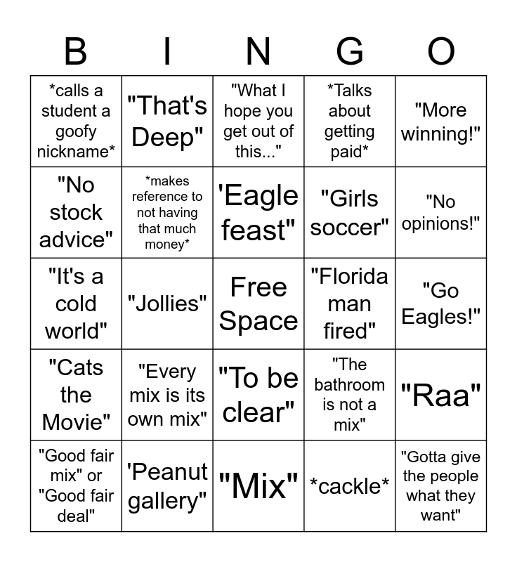 This bingo card has a free space and 24 words: "Every mix is its own mix", 'Peanut gallery", 'Eagle feast", "Good fair mix" or "Good fair deal", "More winning!", *calls a student a goofy nickname*, "No stock advice", "That's Deep", "Florida man fired", "To be clear", "Girls soccer", "It's a cold world", "The bathroom is not a mix", "Raa", *makes reference to not having that much money*, *cackle*, "Go Eagles!", "What I hope you get out of this...", "No opinions!", "Jollies", "Gotta give the people what they want", "Cats the Movie", *Talks about getting paid* and "Mix".