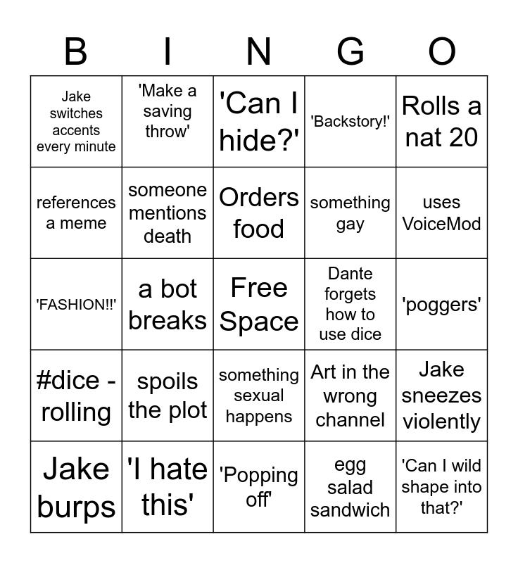 This bingo card has a free space and 34 words: 'So Basically', egg salad sandwich, Graphic death scene, 'I'm going to pray to...', #dice -rolling, someone mentions death, Rolls a nat 20, Jake burps, 'Make a saving throw', 'something something', Orders food, 'Can I hide?', wasting time on a puzzle we already answered, 'hehehe', Dante forgets how to use dice, uses VoiceMod, 'I hate this', 'FASHION!!', spoils the plot, Art in the wrong channel, something sexual happens, 'Actually', Jake switches accents every minute, 'poggers', 'Popping off', 'Can I wild shape into that?', 'Backstory!', something gets taken out of context, something gay, references a meme, soundboard, a bot breaks, Jake sneezes violently and Ultan screams.