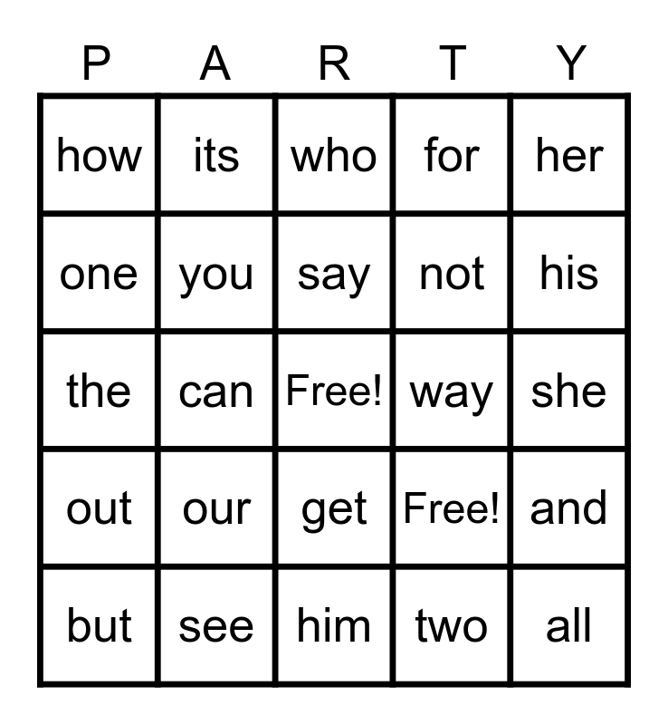 This bingo card has a free space and 25 words: our, him, say, but, her, how, one, its, way, get, not, the, Free!, and, you, now, she, who, his, can, all, see, out, for and two.