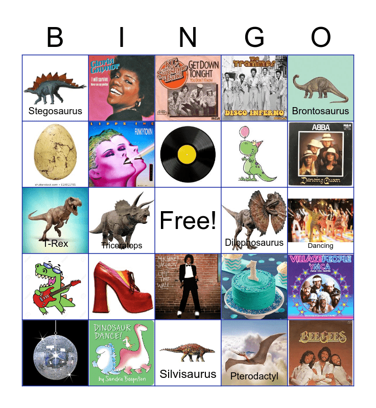 This bingo card has 26 images, a free space and 9 words: Pterodactyl, Brontosaurus, Stegosaurus, Dancing, T-Rex, Triceratops, Velociraptor, Silvisaurus and Dilophosaurus.