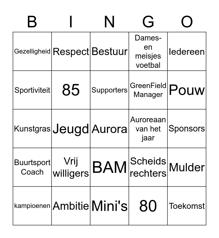 This bingo card has a free space and 24 words: Vrij willigers, Ambitie, Supporters, kampioenen, Iedereen, Gezelligheid, Sportiviteit, Respect, Auroreaan van het jaar, BAM, GreenField Manager, Kunstgras, Scheids rechters, Mulder, 85, 80, Sponsors, Bestuur, Pouw, Jeugd, Toekomst, Buurtsport Coach, Dames- en meisjes voetbal and Mini's.