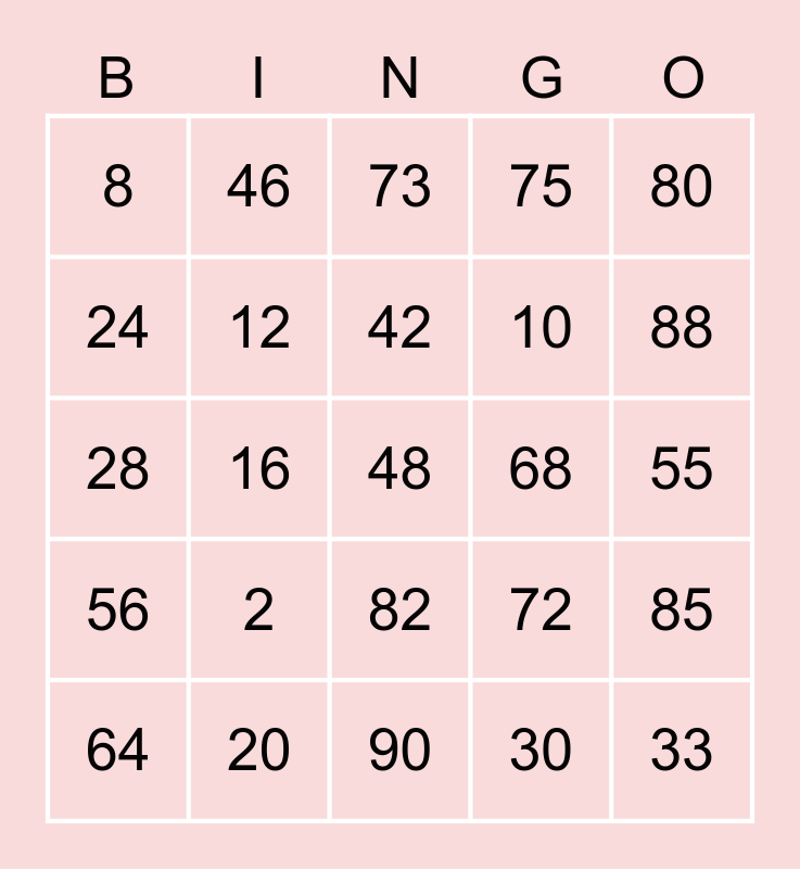 This bingo card has a free space and 24 words: 2, 20, 42, 64, 80, 8, 24, 46, 68, 82, 10, 28, 72, 85, 12, 30, 55, 73, 88, 16, 33, 56, 75 and 90.