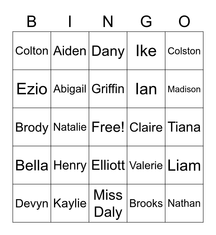 This bingo card has a free space and 24 words: Henry, Kaylie, Griffin, Devyn, Colston, Colton, Ezio, Aiden, Claire, Elliott, Ian, Brody, Valerie, Liam, Abigail, Brooks, Tiana, Dany, Madison, Natalie, Nathan, Bella, Ike and Miss Daly.