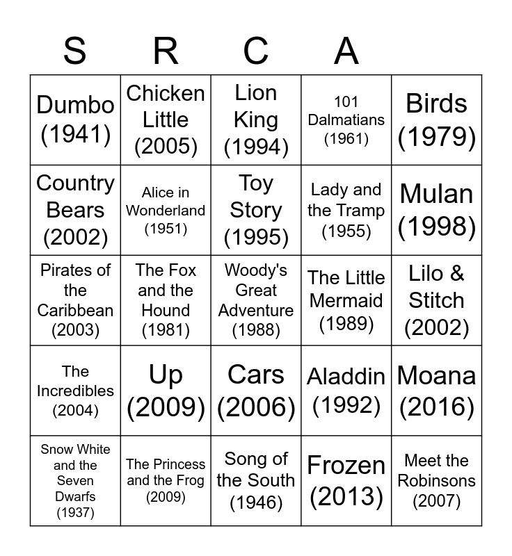 This bingo card has 57 words: Mickey Mouse Universe (1928), Snow White and the Seven Dwarfs (1937), Pinocchio (1940), Dumbo (1941), Song of the South (1946), Cinderella (1950), Alice in Wonderland (1951), Peter Pan (1953), Lady and the Tramp (1955), Sleeping Beauty (1959), 101 Dalmatians (1961), The Sword in the Stone (1963), Mary Poppins (1964), Winnie the Pooh (1966), The Jungle Book (1967), Robin Hood (1973), Birds (1979), The Fox and the Hound (1981), Who Framed Roger Rabbit (1988), Woody's Great Adventure (1988), The Little Mermaid (1989), Beauty and the Beast (1991), Aladdin (1992), Lion King (1994), Pocahontas (1995), Toy Story (1995), The Hunchback of Notre Dame (1996), Hercules (1997), Mulan (1998), A Bug's Life (1998), Tarzan (1999), The Emperor's New Groove (2000), Monsters, Inc. (2001), Treasure Planet (2002), Lilo & Stitch (2002), Country Bears (2002), Finding Nemo (2003), Pirates of the Caribbean (2003), Brother Bear (2003), The Incredibles (2004), Chicken Little (2005), Cars (2006), Meet the Robinsons (2007), Ratatouille (2007), WALL-E (2008), Bolt (2008), Up (2009), The Princess and the Frog (2009), Tangled (2010), Brave (2012), Wreck-It Ralph (2012), Frozen (2013), Big Hero 6 (2014), Inside Out (2015), Zootopia (2016), Moana (2016) and Coco (2017).