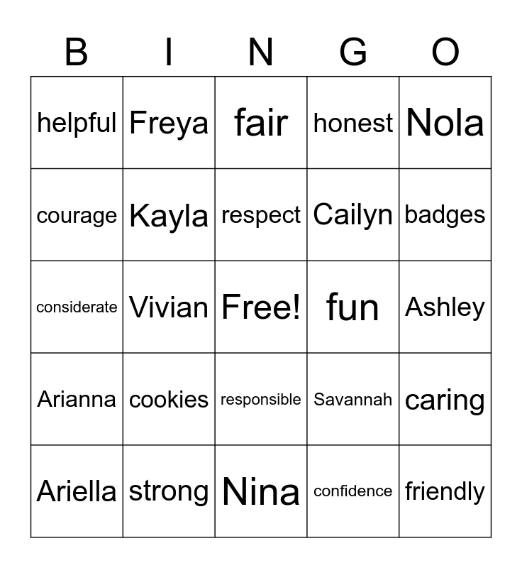This bingo card has a free space and 24 words: cookies, strong, respect, Ariella, Nola, helpful, courage, Freya, fun, responsible, Cailyn, considerate, Savannah, caring, Kayla, confidence, Ashley, fair, badges, Vivian, friendly, Arianna, honest and Nina.