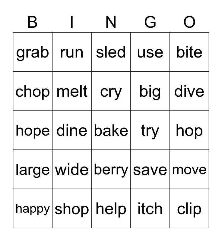 This bingo card has a free space and 24 words: wide, shop, cry, happy, bite, grab, chop, run, try, berry, big, hope, save, move, melt, itch, hop, sled, dive, dine, clip, large, use and help.