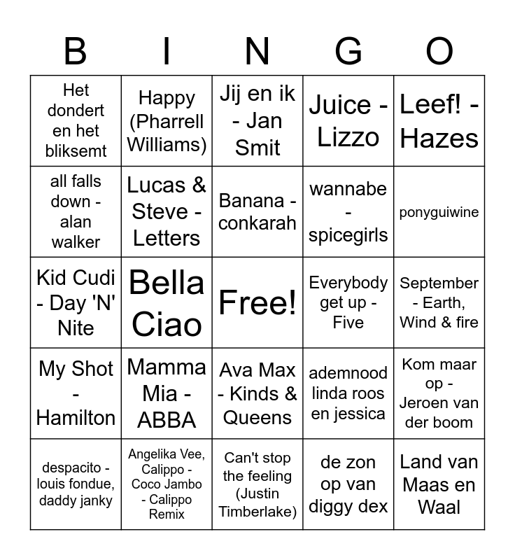 This bingo card has a free space and 40 words: Mr. Takata - Tacata' party mix, Kid Cudi - Day 'N' Nite, Dario G - Sunchyme, Lucas & Steve - Letters, Angelika Vee, Calippo - Coco Jambo - Calippo Remix, Ava Max - Kinds & Queens, Banana - conkarah, The Soca Boys, van B. King - Follow the Leader, Leef! - Hazes, My Shot - Hamilton, Bella Ciao, Juice - Lizzo, Land van Maas en Waal, September - Earth, Wind & fire, Everybody get up - Five, Mamma Mia - ABBA, Ik leef niet meer voor jou - Marco Borsato, Het dondert en het bliksemt, Zij weet het - tino Martin, Jij en ik - Jan Smit, Kom maar op - Jeroen van der boom, de zon op van diggy dex, wannabe - spicegirls, all falls down - alan walker, Janet Jackson - Together Again, Lionel Richie - Angel, Dolly Parton - Jolene, Earth Wind and Fire - September, Queen - I want to break free, bloem - even aan mijn moeder vragen, wild rover - dubliners, despacito - louis fondue, daddy janky, altijd lente tandarts assitente, ademnood linda roos en jessica, ponyguiwine, Can't stop the feeling (Justin Timberlake), Feesttent (Kraantje Pappie), Levels (Avicii), Happy (Pharrell Williams) and Roos (Batiste).