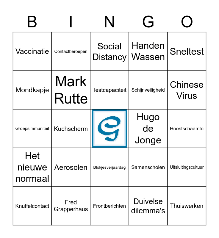 This bingo card has a free space and 76 words: Viruswappie, Diederik Gommers, Social Distancy, Afhaalmenu's, Klappen voor de Zorg, Isolatie, Essentiële beroepen, Beeldbellen, Besmetten, Elleboog-groet, GGD, Vleermuis, Testcapaciteit, Mondkapje, Ernst Kuipers, Kuchscherm, Irmaatje, Thuiswerken, RIVM, Sneltest, Viroloog, Groepsimmuniteit, Mark Rutte, Contactberoepen, Handen Wassen, Uitbraak, Deurbeleid, Looproute, Anderhalvemeter Samenleving, Hamsteren, Coronavaccin, Zoomen, Superspreader, Samenscholen, Chinese Virus, Schijnveiligheid, Coronatest, Raamzwaaien, Hoestschaamte, Duivelse dilemma's, Desinfecteren, Handhaving, Quarantainekilo's, Jaap van Dissel, Teststraat, Lockdownfeestjes, Knuffelcontact, Vaccinatie, Marion Koopmans, Corona, Incubatietijd, Blokjesverjaardag, Anderhalvemeter knuffels, Ab Oosterhuis, Lockdown, Intelligente Lockdown, Persconferentie, Raamvisites, Bubbel, Hamsterschaamte, Aerosolen, I.C., COVID 19, Code Geel, Zelfquarantaine, Covidioot, Hugo de Jonge, Coronavermoeidheid, Winkelwagens ontsmetten, Vitale beroepen, Uitsluitingscultuur, Het nieuwe normaal, Fred Grapperhaus, Elleboog hoesten, Frontberichten and Balkonoptreden.