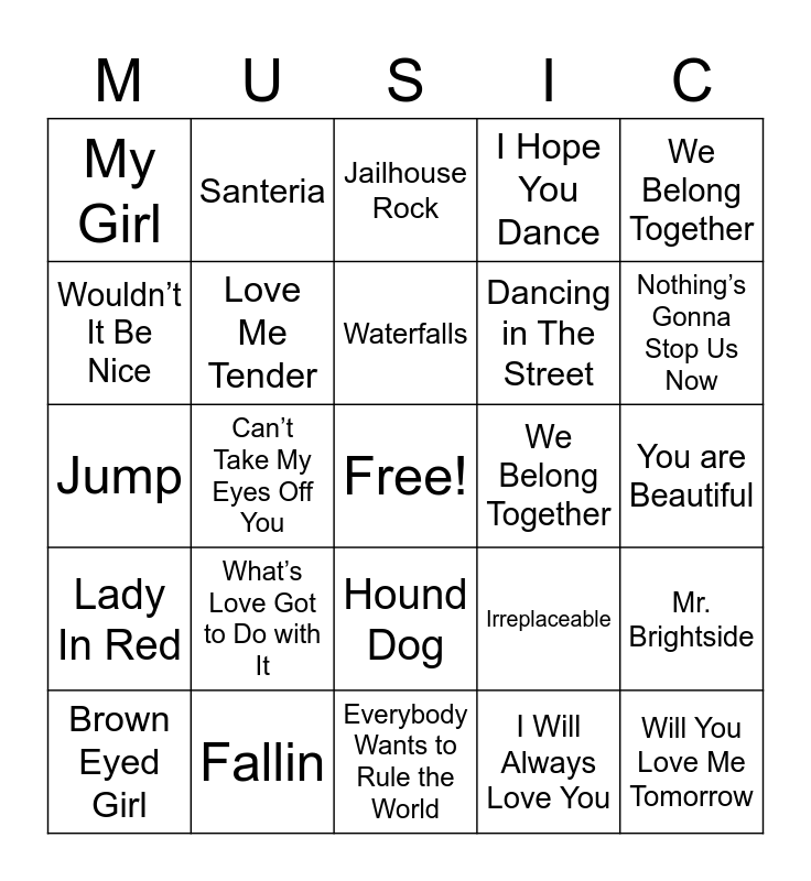 This bingo card has a free space and 85 words: Tutti Frutti, Twist and Shout, Jailhouse Rock, Come Fly with Me, Put Your Head on My Shoulder, Rock Around the Clock, All Shook Up, Please Please Please, Splish Splash, Tequila, Love Is Strange, Mambo No. 5, Love Me Tender, We Belong Together, I’m a Believer, My Girl, Brown Eyed Girl, Wouldn’t It Be Nice, Bad Moon Rising, You Can’t Hurry Love, Respect, Dancing in The Street, Will You Love Me Tomorrow, Build Me Up Buttercup, Can’t Take My Eyes Off You, I Say a Little Prayer, L-O-V-E, Can’t Help Falling in Love, I Want to Know What Love Is, Pour Some Sugar on Me, What’s Love Got to Do with It, Careless Whisper, Right Here Waiting, Jump, Sweet Dream, Don’t You Want Me, Everybody Wants to Rule the World, Make It Real, Lady In Red, Nothing’s Gonna Stop Us Now, Red Red Wine, Africa, I Swear, Losing My Religion, Livin’ La Vida Loca, Unbreak My Heart, Macarena, Wannabe, Truly Madly Deeply, Smooth, Santeria, Waterfalls, Nothing Compares 2 U, This Is How We Do It, Oops! I Did it Again, We Didn’t Start the Fire, Fallin, I Hope You Dance, I’m Yours, Back to Black, Viva La Vida, Before He Cheats, The Way You Love Me, It’s Five O’Clock Somewhere, Bye Bye Bye, We Belong Together, Hip Don’t Lie, Mr. Brightside, Beautiful Girls, Pocketful of Sunshine, Good Vibration, Every Breath You Take, All About That Bass, Be My Baby, How Do I Live, Hound Dog, I Will Always Love You, River Deep Mountain High, Let It Be, La Bamba, You are Beautiful, Tiny Dancer, Whatcha Say, Irreplaceable and Sweet Caroline.