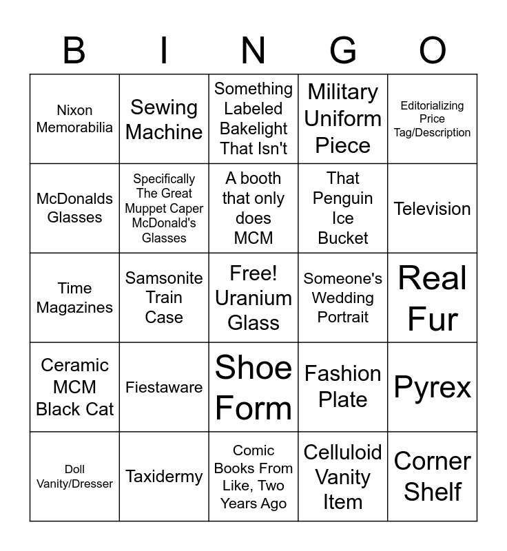 This bingo card has a free space and 24 words: Fiestaware, Taxidermy, A booth that only does MCM, Doll Vanity/Dresser, Editorializing Price Tag/Description, Nixon Memorabilia, McDonalds Glasses, Sewing Machine, Someone's Wedding Portrait, Shoe Form, That Penguin Ice Bucket, Time Magazines, Fashion Plate, Pyrex, Specifically The Great Muppet Caper McDonald's Glasses, Celluloid Vanity Item, Real Fur, Something Labeled Bakelight That Isn't, Television, Samsonite Train Case, Corner Shelf, Ceramic MCM Black Cat, Military Uniform Piece and Comic Books From Like, Two Years Ago.
