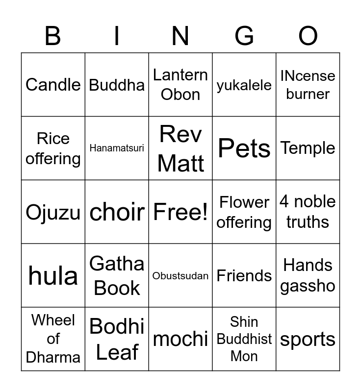 This bingo card has a free space and 24 words: Gatha Book, Bodhi Leaf, Rev Matt, Wheel of Dharma, INcense burner, Candle, Rice offering, Buddha, Flower offering, Obustsudan, Pets, Ojuzu, Friends, Hands gassho, Hanamatsuri, Shin Buddhist Mon, 4 noble truths, Lantern Obon, Temple, choir, sports, hula, yukalele and mochi.