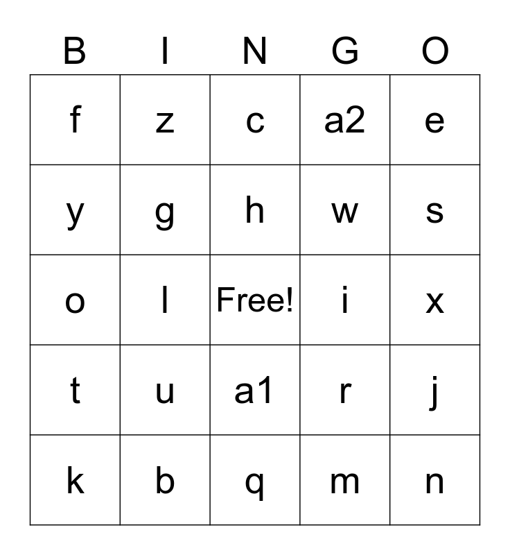 This bingo card has a free space and 29 words: a, b, c, d, e, f, g, h, i, j, k, l, m, n, o, p, q, r, s, t, u, v, w, x, y, z, a1, a2 and a3.