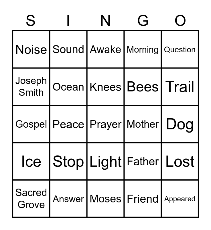 This bingo card has a free space and 29 words: Sacred Grove, Camp, Peace, Fishing, Noise, Awake, Ocean, Stop, Mother, Answer, Dog, Appeared, Moses, Friend, Trail, Boat, Light, Ice, Question, Gospel, Father, Actions, Bees, Joseph Smith, Morning, Sound, Lost, Knees and Son.