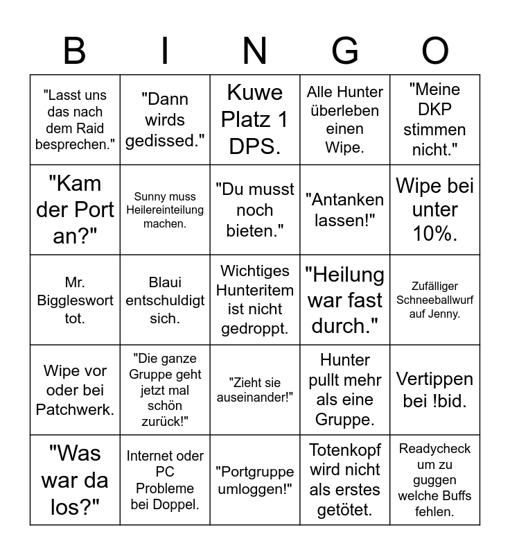 This bingo card has 25 words: "Die ganze Gruppe geht jetzt mal schön zurück!", "Portgruppe umloggen!", "Du musst noch bieten.", "Was war da los?", "Meine DKP stimmen nicht.", "Lasst uns das nach dem Raid besprechen.", "Kam der Port an?", "Dann wirds gedissed.", "Heilung war fast durch.", "Zieht sie auseinander!", "Antanken lassen!", Mr. Biggleswort tot., Hunter pullt mehr als eine Gruppe., Vertippen bei !bid., Sunny muss Heilereinteilung machen., Readycheck um zu guggen welche Buffs fehlen., Zufälliger Schneeballwurf auf Jenny., Kuwe Platz 1 DPS., Wipe bei unter 10%., Blaui entschuldigt sich., Wichtiges Hunteritem ist nicht gedroppt., Internet oder PC Probleme bei Doppel., Wipe vor oder bei Patchwerk., Alle Hunter überleben einen Wipe. and Totenkopf wird nicht als erstes getötet..