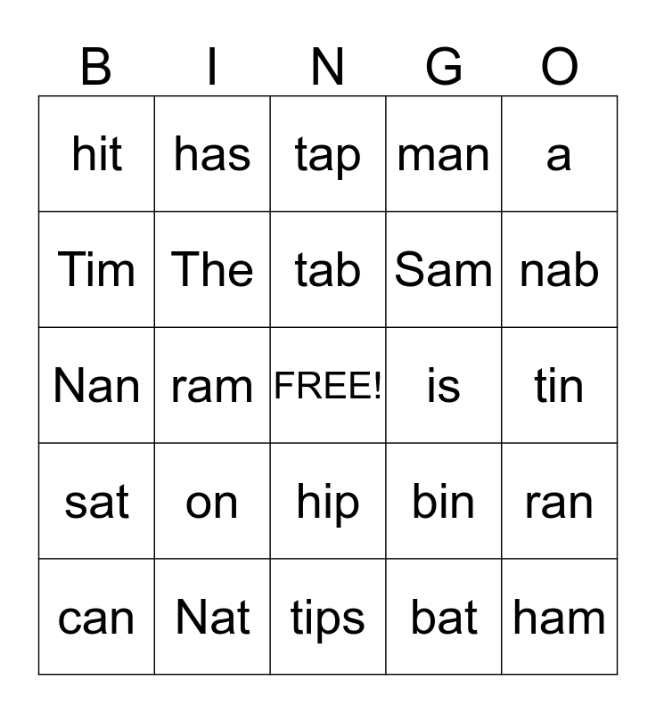 This bingo card has a free space and 34 words: Bass, bat, cat, Pat, sat, The, a, can, has, pass, tab, tap, hat, in, is, nab, Nat, Nan, on, bin, hip, his, hit, tin, tips, ham, man, map, Sam, Tim, at, ram, ran and rat.