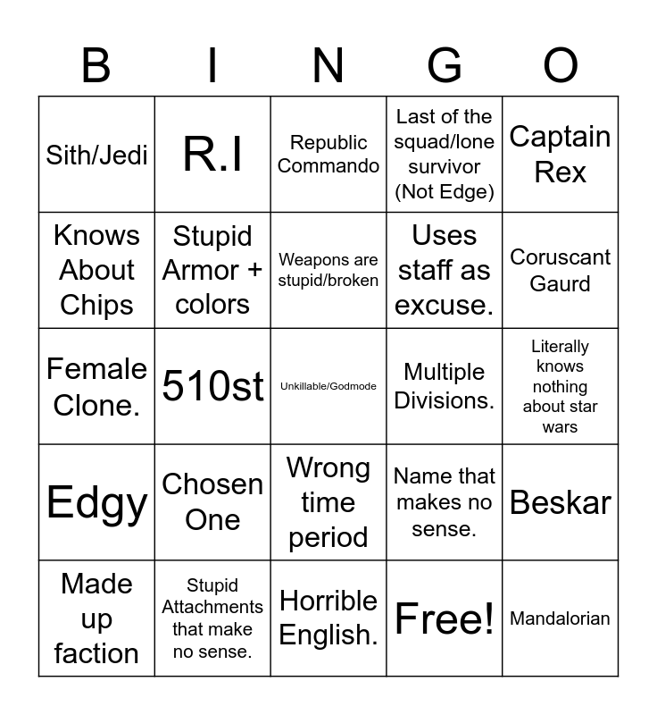 This bingo card has 30 words: Stupid Attachments that make no sense., ARC, 510st, Rank that makes no sense/against the rules., Sith/Jedi, Republic Commando, Stupid Armor + colors, Wrong time period, Multiple Divisions., Horrible English., Literally knows nothing about star wars, Unkillable/Godmode, Free!, Mandalorian, Coruscant Gaurd, Commander Cody, Name that makes no sense., Edgy, Chosen One, Captain Rex, Female Clone., Duel Blasters., R.I, Uses staff as excuse., Knows About Chips, Last of the squad/lone survivor (Not Edge), Beskar, Made up faction, Weapons are stupid/broken and External Media/Anime Reference.