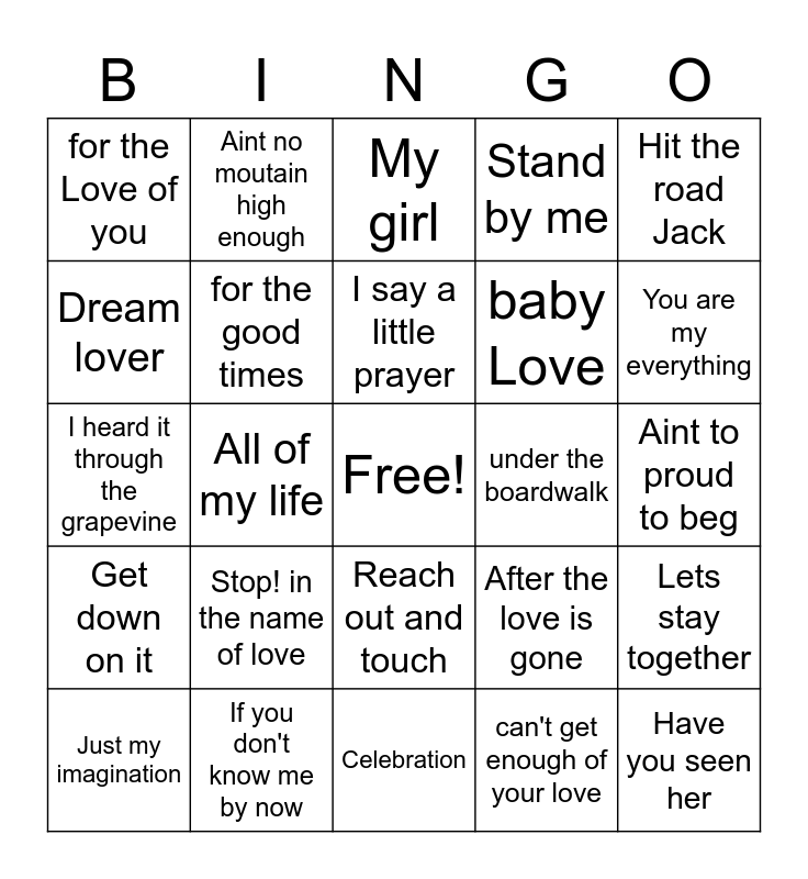 This bingo card has a free space and 24 words: Stop! in the name of love, If you don't know me by now, I say a little prayer, Just my imagination, Hit the road Jack, for the Love of you, Dream lover, Aint no moutain high enough, under the boardwalk, Reach out and touch, baby Love, I heard it through the grapevine, After the love is gone, Lets stay together, for the good times, can't get enough of your love, Aint to proud to beg, My girl, You are my everything, All of my life, Have you seen her, Get down on it, Stand by me and Celebration.