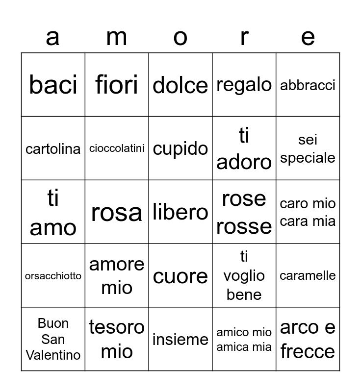 This bingo card has a free space and 24 words: amore mio, tesoro mio, cupido, Buon San Valentino, abbracci, baci, cartolina, fiori, rose rosse, cuore, ti adoro, ti amo, ti voglio bene, caramelle, cioccolatini, amico mio amica mia, caro mio cara mia, dolce, sei speciale, rosa, arco e frecce, orsacchiotto, regalo and insieme.