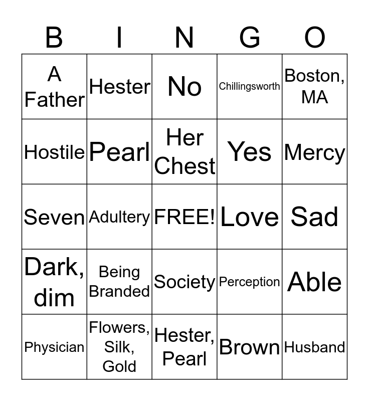 This bingo card has a free space and 24 words: Being Branded, Flowers, Silk, Gold, Her Chest, Physician, Boston, MA, A Father, Hostile, Hester, Love, Society, Yes, Seven, Perception, Able, Pearl, Brown, Sad, No, Mercy, Adultery, Husband, Dark, dim, Chillingsworth and Hester, Pearl.