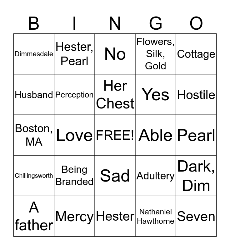 This bingo card has a free space and 24 words: Being Branded, Mercy, Her Chest, A father, Cottage, Dimmesdale, Husband, Hester, Pearl, Able, Sad, Yes, Boston, MA, Adultery, Dark, Dim, Perception, Nathaniel Hawthorne, Pearl, No, Hostile, Love, Seven, Chillingsworth, Flowers, Silk, Gold and Hester.