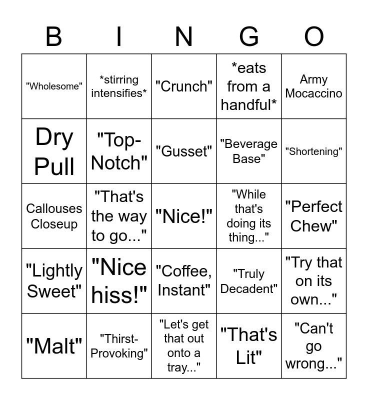 This bingo card has a free space and 24 words: "Nice hiss!", "Thirst-Provoking", "Gusset", "Malt", Army Mocaccino, "Wholesome", Dry Pull, *stirring intensifies*, "While that's doing its thing...", "Coffee, Instant", "Beverage Base", Callouses Closeup, "Truly Decadent", "Try that on its own...", "Top-Notch", "That's Lit", "Perfect Chew", "Crunch", "Shortening", "That's the way to go...", "Can't go wrong...", "Lightly Sweet", *eats from a handful* and "Let's get that out onto a tray...".